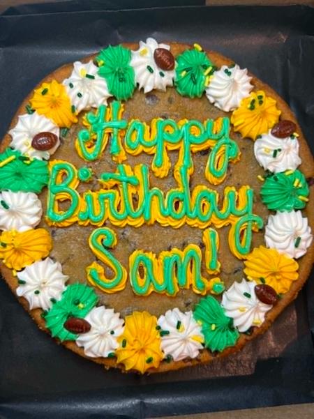 Our cookie cakes are made fresh and decorated fresh. A 24-hour notice is required to order.