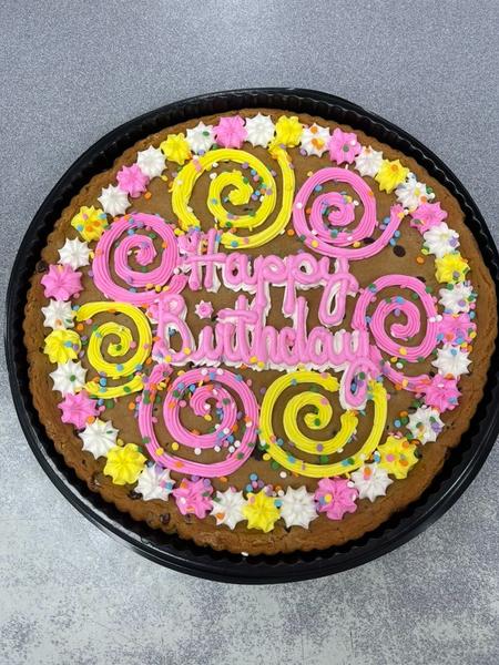 Our cookie cakes are made fresh and decorated fresh. A 24-hour notice is required to order.